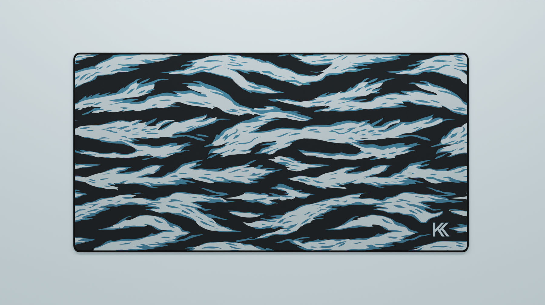 Full view of the Avalanche Tiger Camo Deskmat showing blueish-teal and dark navy tiger stripe camouflage with hemmed edges.