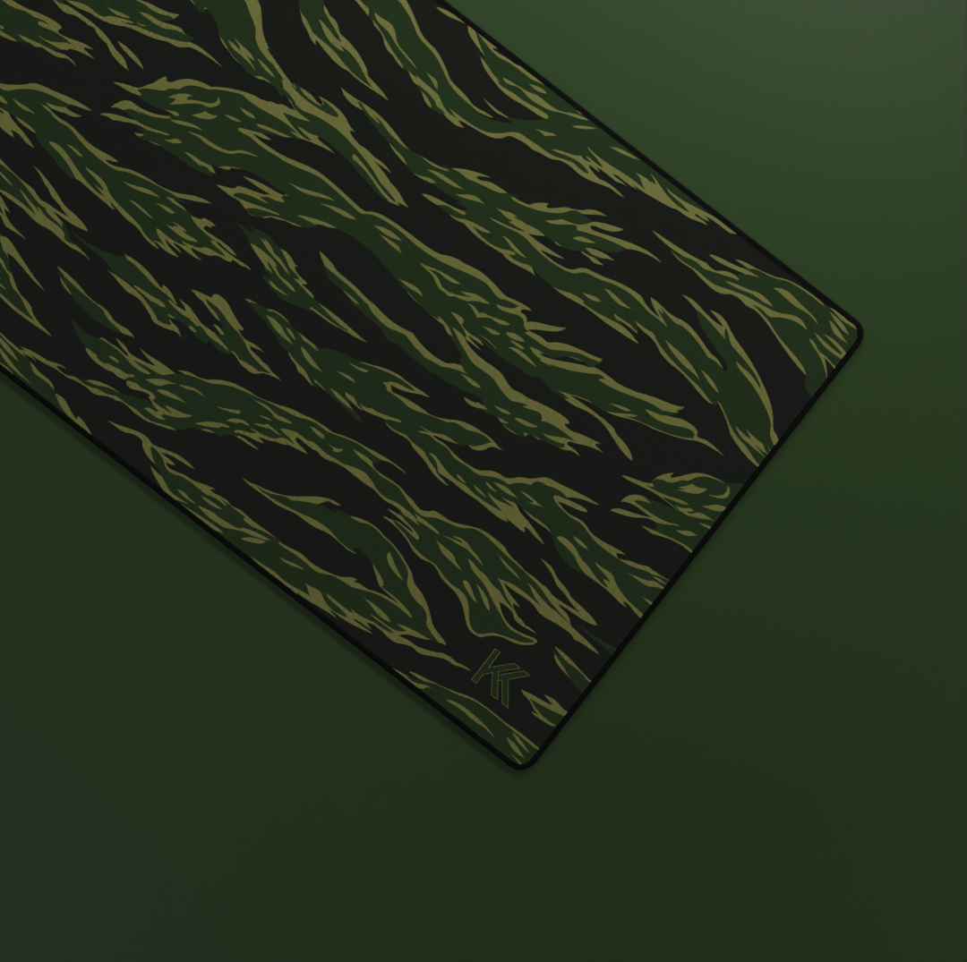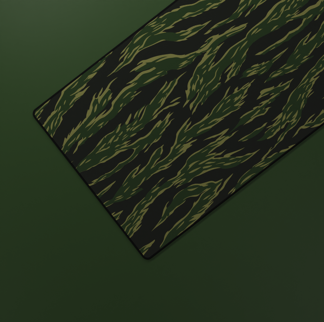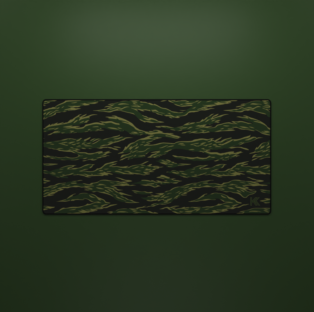 Bring a rugged, nature-inspired look to your desk with the Forest Tiger Camo Deskmat — a deep green and black camouflage pattern inspired by tiger stripes in dense forest environments. This bold design adds an adventurous touch to gaming, creative, or office setups.
