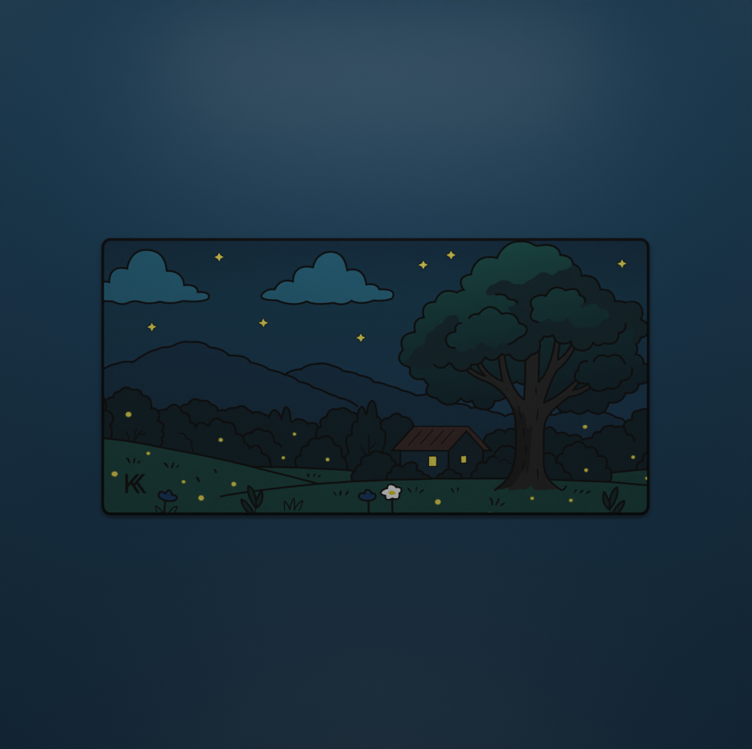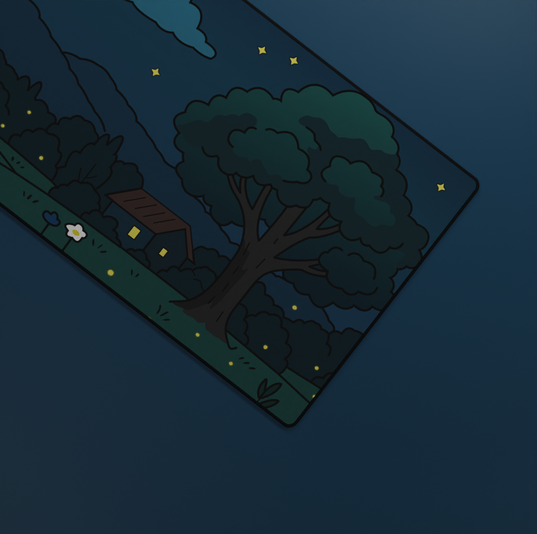 Drift into tranquility with the Midnight Meadow Deskmat, featuring a peaceful night scene under a star-filled sky. Fireflies glow softly across the field, a small cabin light flickers in the distance, and a towering tree stands against gentle blue mountains — capturing the quiet beauty of a summer night.