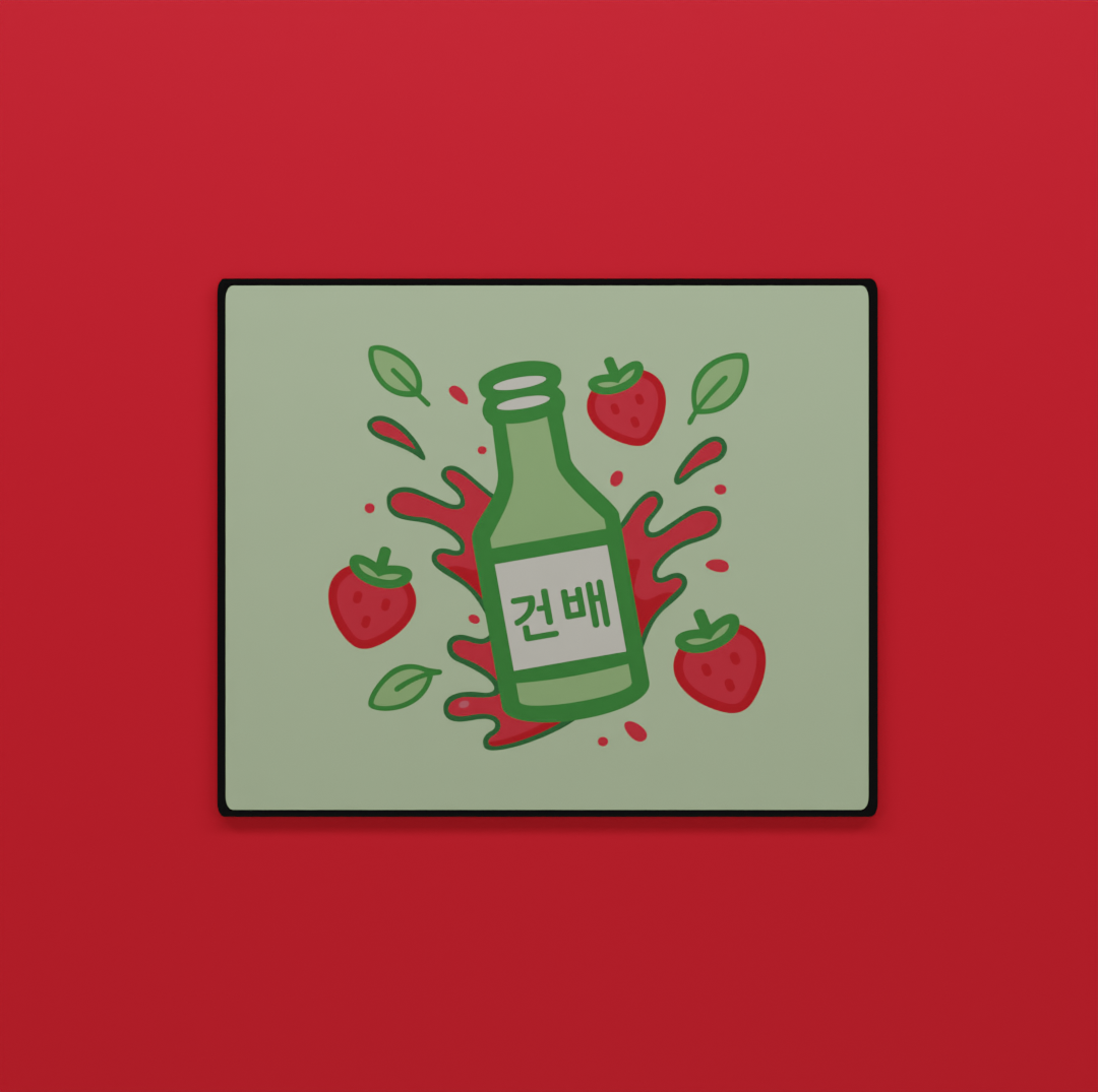 The Strawberry Soju Mini Mousepad captures the sweet and playful energy of one of Korea’s favorite soju flavors. Featuring bright red strawberries, green leaves, and a splash of color around the classic soju bottle, this design brings a fun and fruity vibe to any workspace.