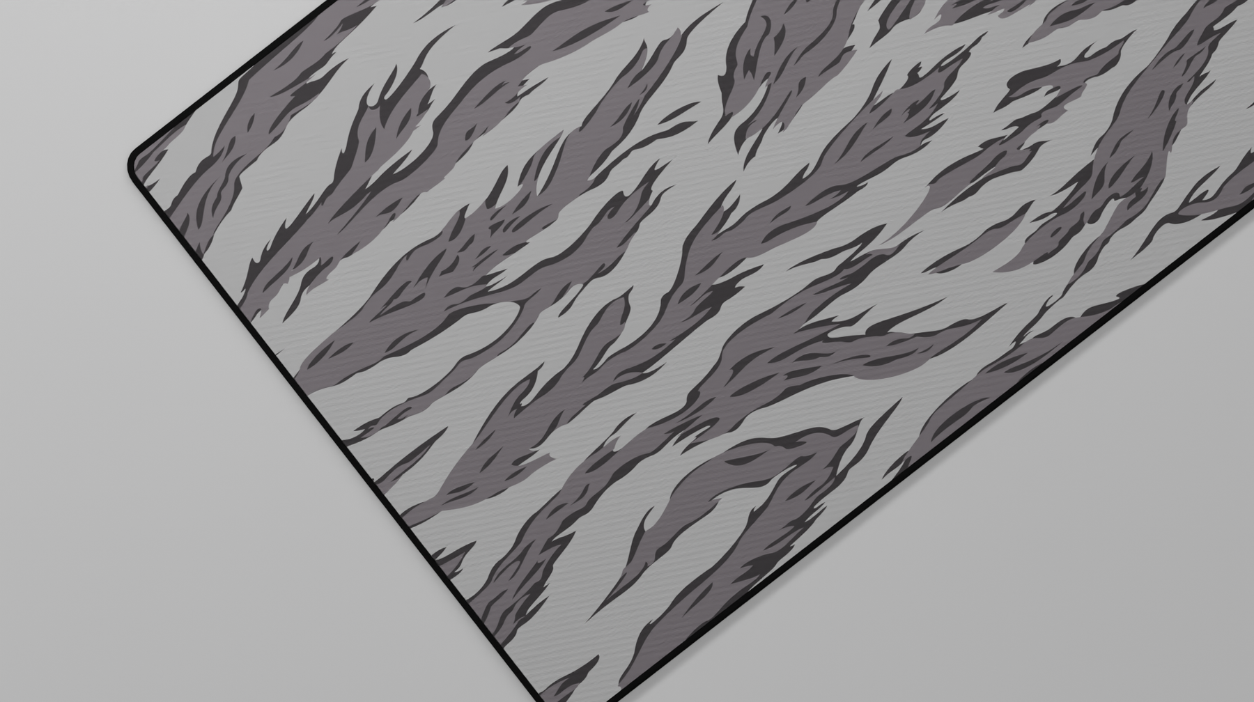Full view of the Winter Tiger Camo Deskmat showing varying grey tiger stripe camouflage with hemmed edges.